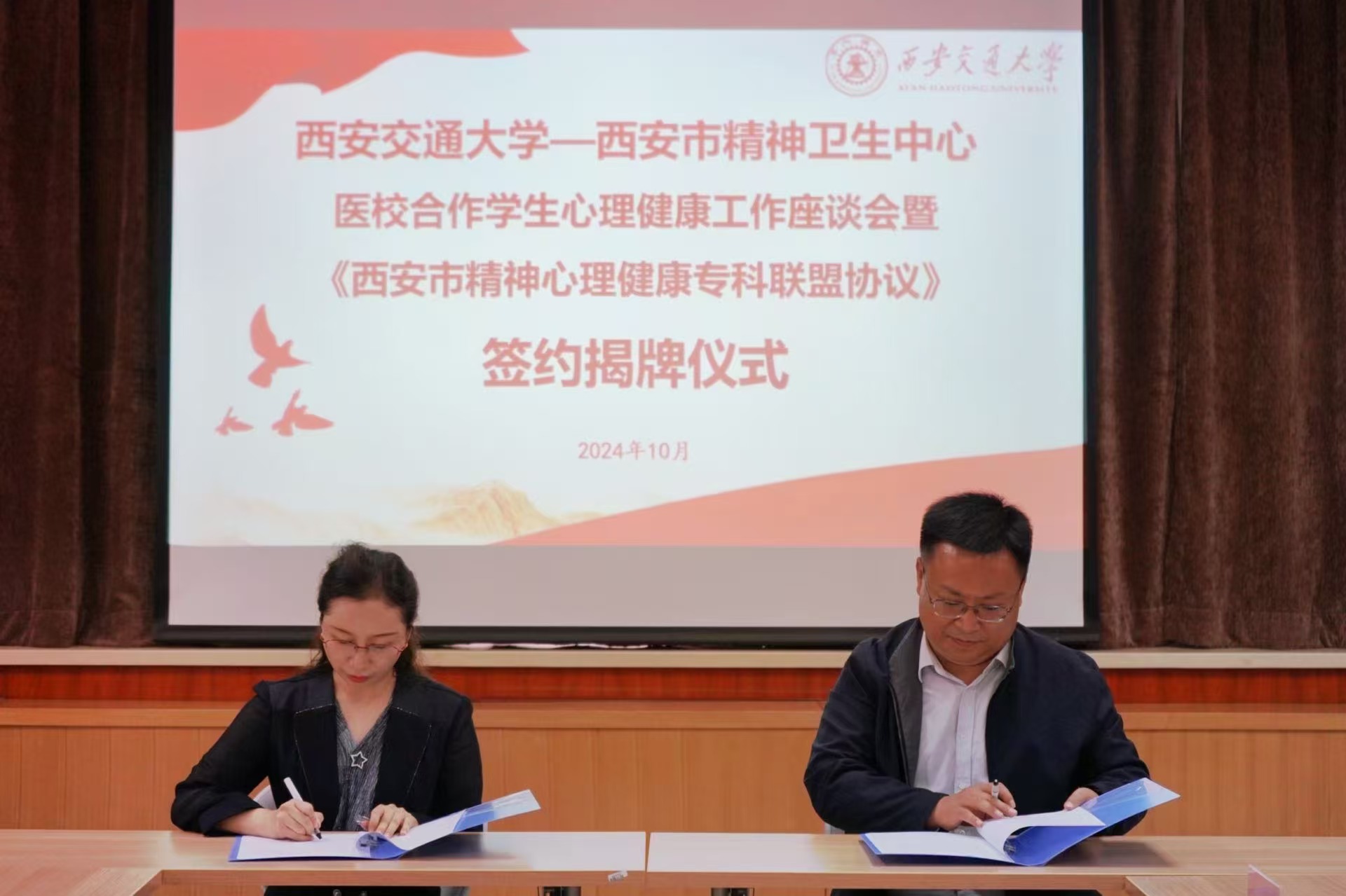 2024年10月16日,西安市精神卫生中心(陕西省精神卫生中心)-西安交通大学医校合作学生心理健康工作座谈会暨《西安市精神心理健康专科联盟协议》签约揭牌仪式在西安交大校医院举行。